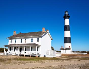 This iconic NC lighthouse is easily recognized by its vibrant black and white striped façade that stands out starkly against blue waters.
